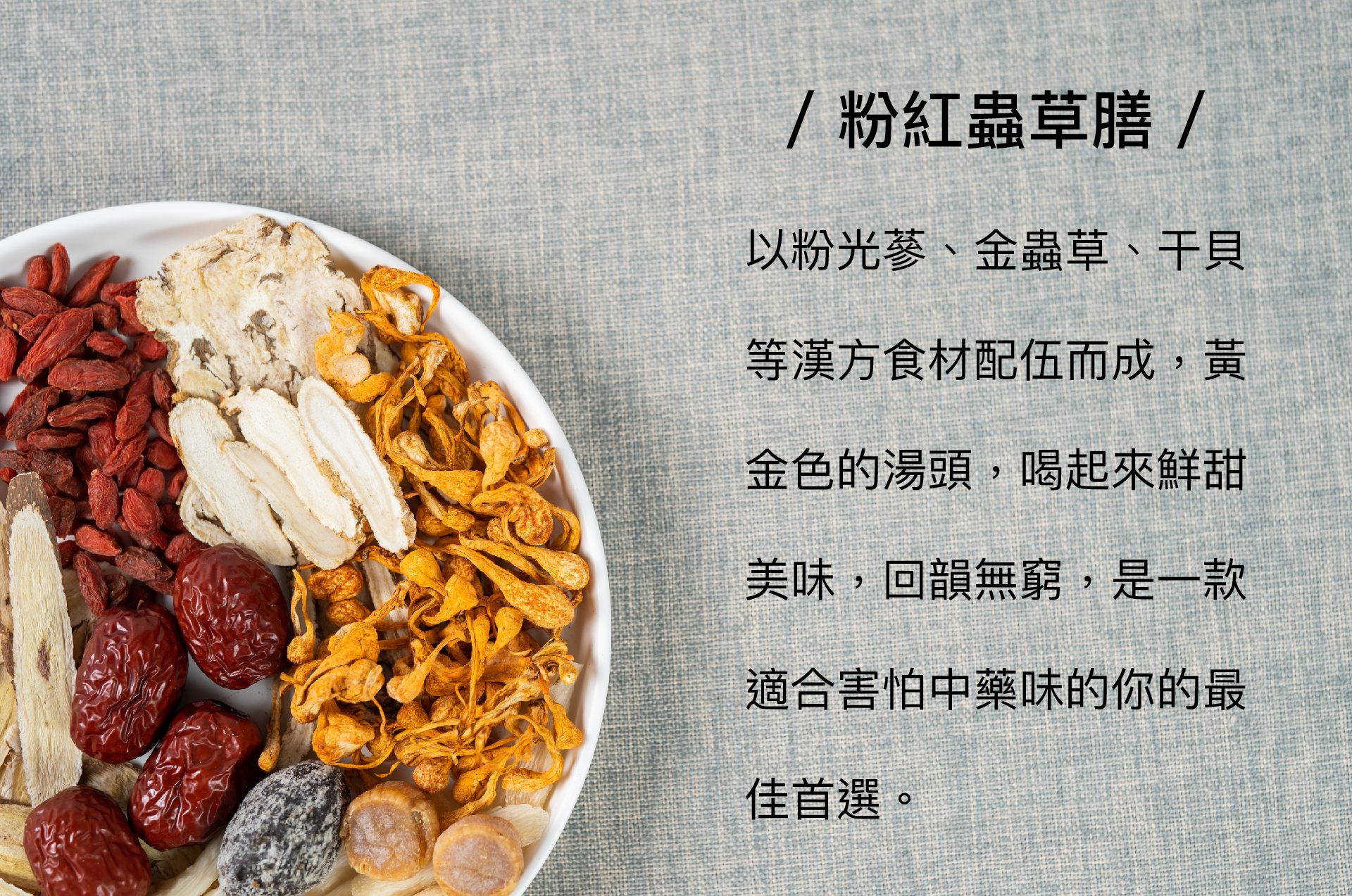 以粉光蔘,金蟲草,干貝登漢方食材配伍而成,黃金色的湯頭,喝起來鮮甜美味,回韻無窮,是適合害怕中藥味的你的最佳首選