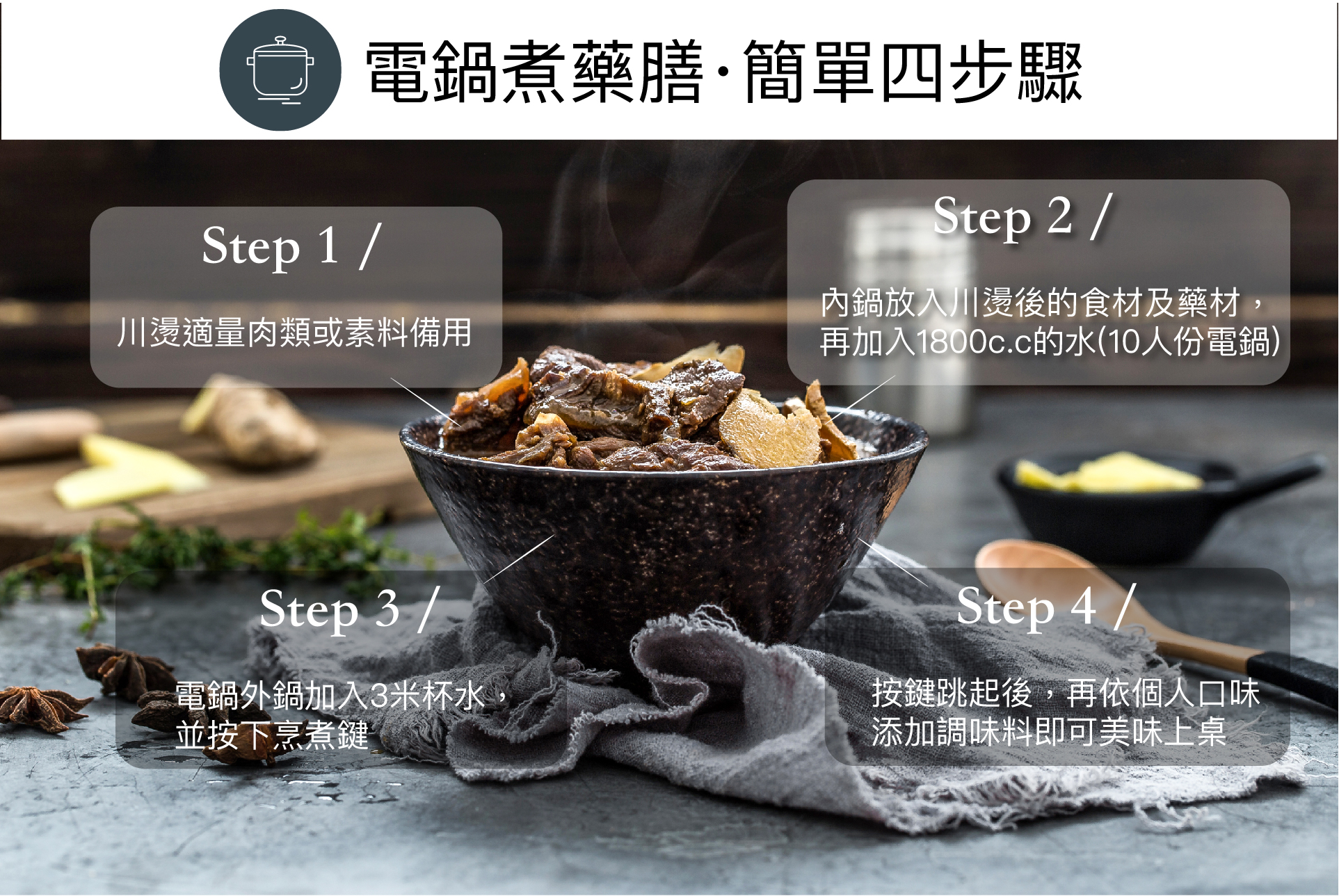 Step 2-內鍋加入所有食材及藥材,並加入1800c.c的水(10米杯)